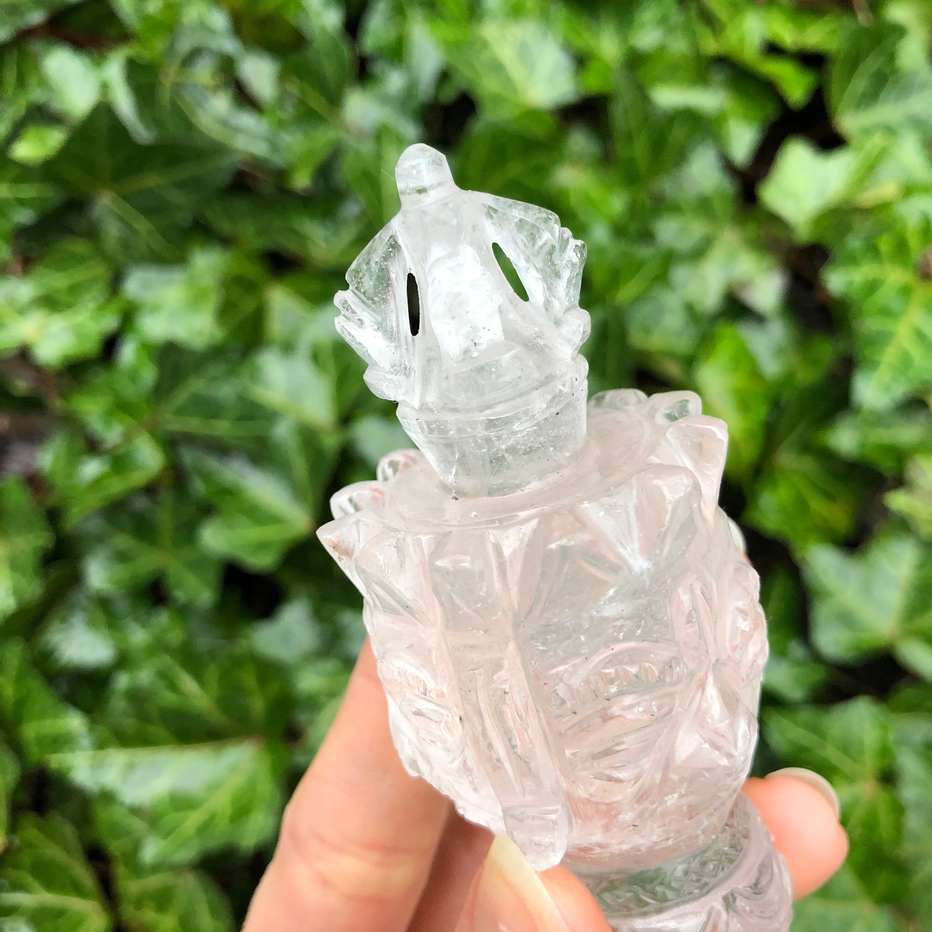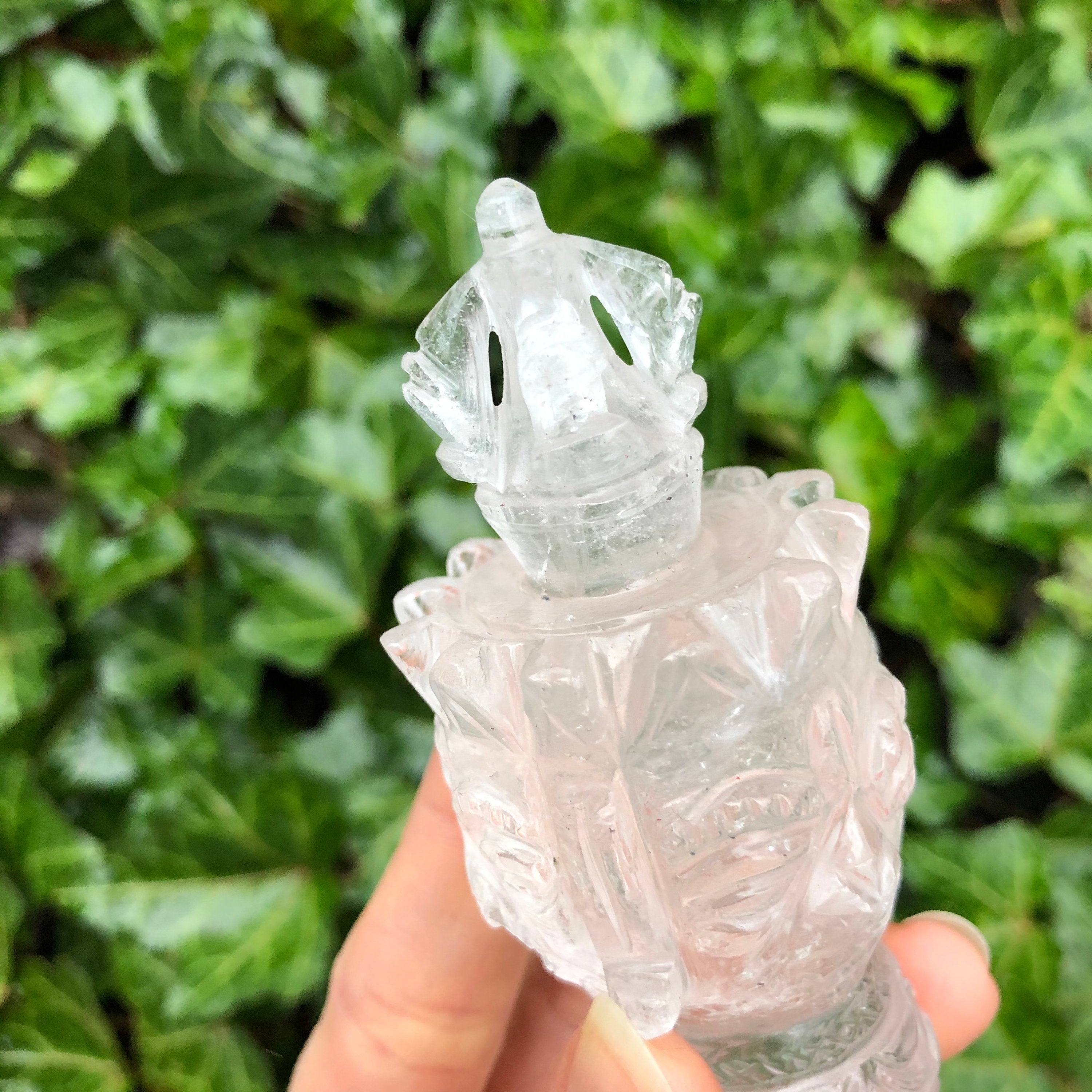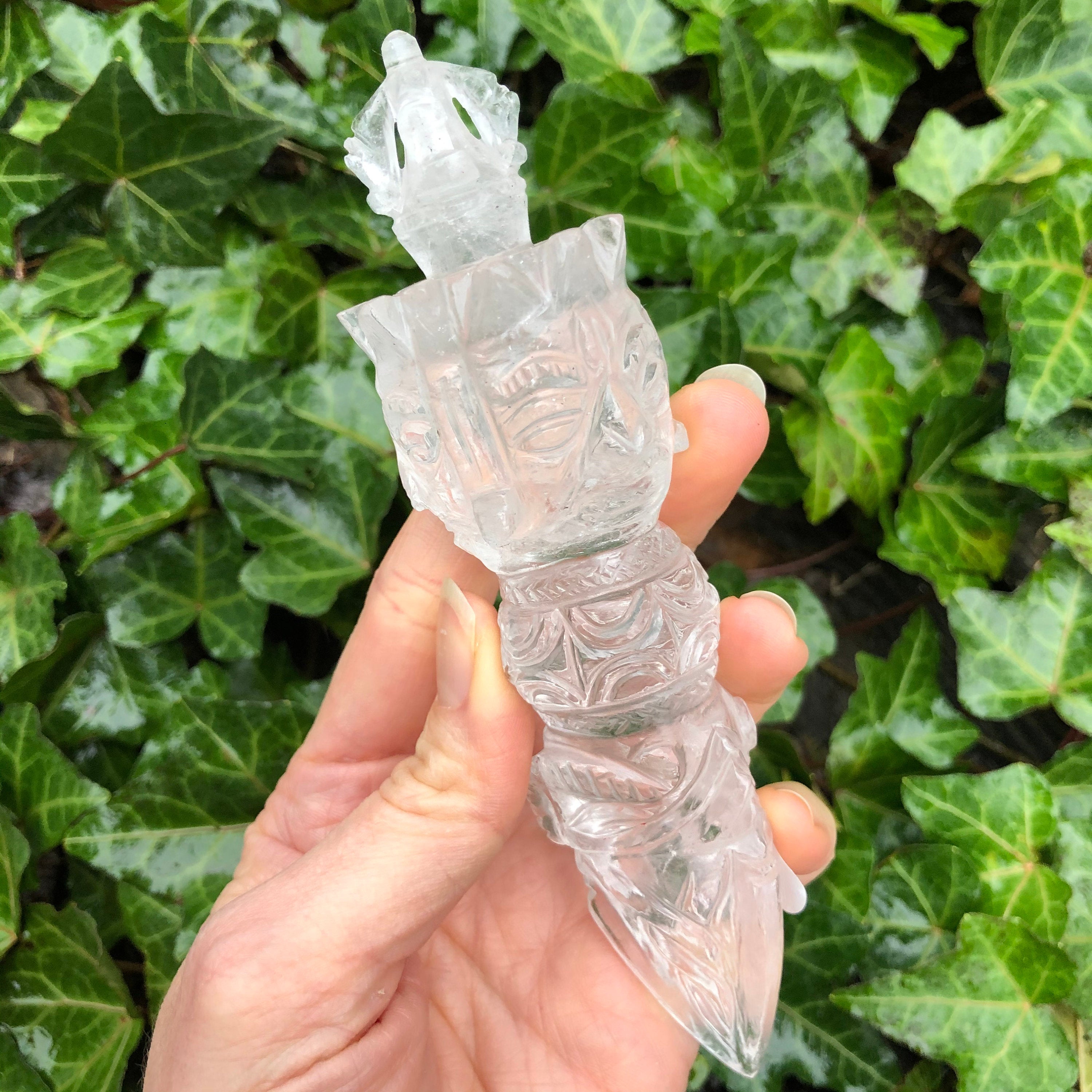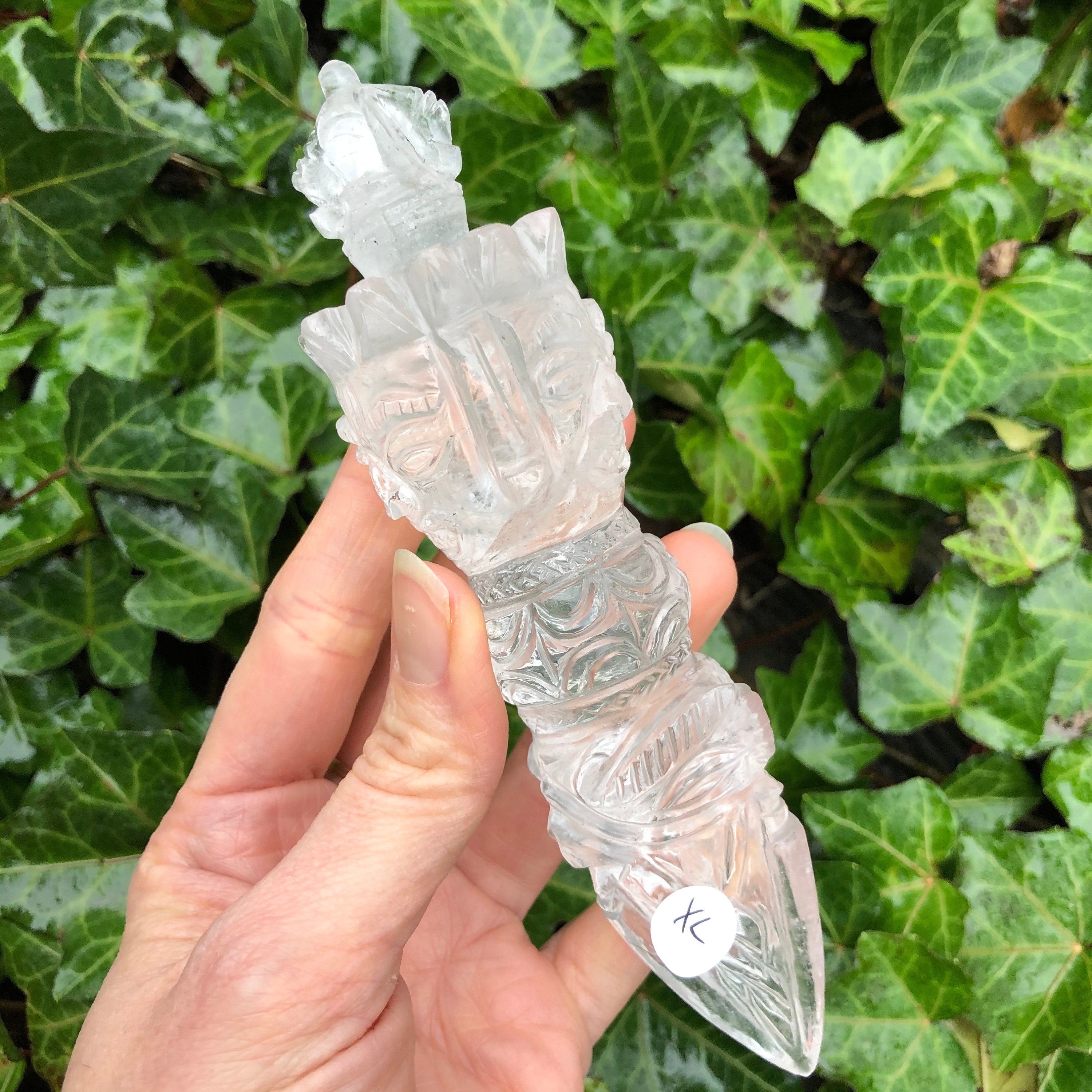 Also called “The Magic Dagger,” the Phurba is a spiritual tool representing the duality of blessings and banishings in Tibetan Buddhist ceremony. The handle, representing blessings, always has carvings, including skulls or the face of the Buddha. The blade, and it’s three sides, represent the banishment and transmutation of negative energies, specifically the “three poisons“: attachment, ignorance, and a version. The crown of the Phurba is where blessings are bestowed by touching it to the crown of one’s head. The sacred tools are also used to consecrate/purify land, to bless and to heal, to make offerings, and during daily meditation. Outside of ceremony, they are placed in temples, meditation rooms, and sacred spaces. While traditionally made of iron, the pieces here are carved from clear quartz, fairly made in India by our vendors who wish to share this beautiful tool with the rest of the world.
